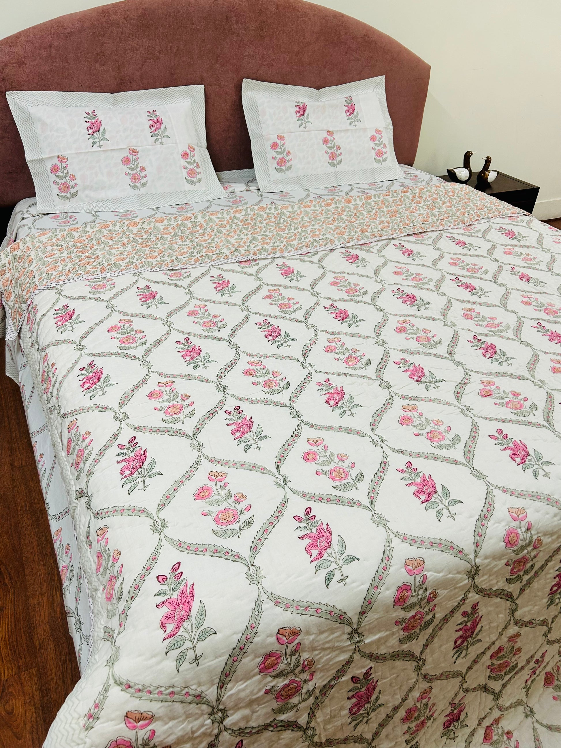 Pink Floral Jaal Reversible Handblock Printed Cotton Quilt